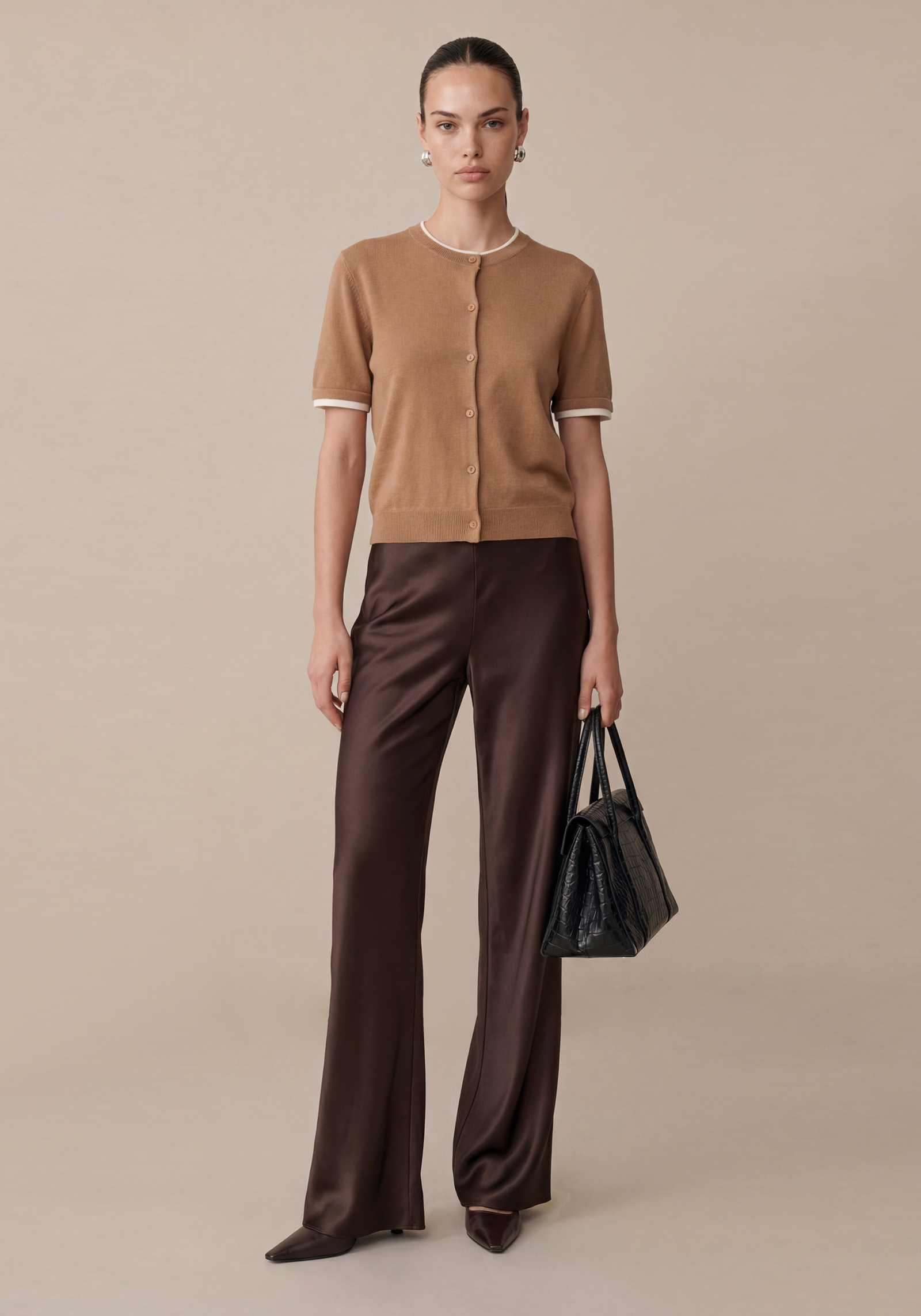 The Ottie Cardigan combines luxurious softness with understated sophistication. This button-up short-sleeve piece features an easy, relaxed fit ideal for layering or standalone wear. Adorable contrast trim adds a special touch to elevate the design.