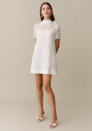The Rae Cotton Dress is an adorable mini featuring a sweet lace shell with short sleeves and an open back detail finished with a bow. Perfect for those who want a playful yet polished look.